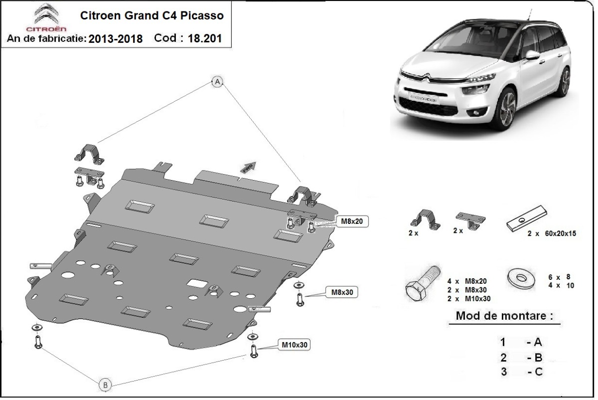 This underbody protection is designed to cover the engine, front bumper, gearbox, and radiator where confirmed for Citroen C4 Picasso.