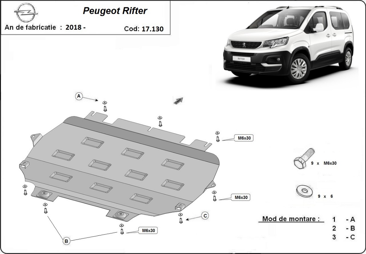 This underbody protection is designed to cover the engine, gearbox, and radiator where confirmed for Peugeot Rifter / Partner.