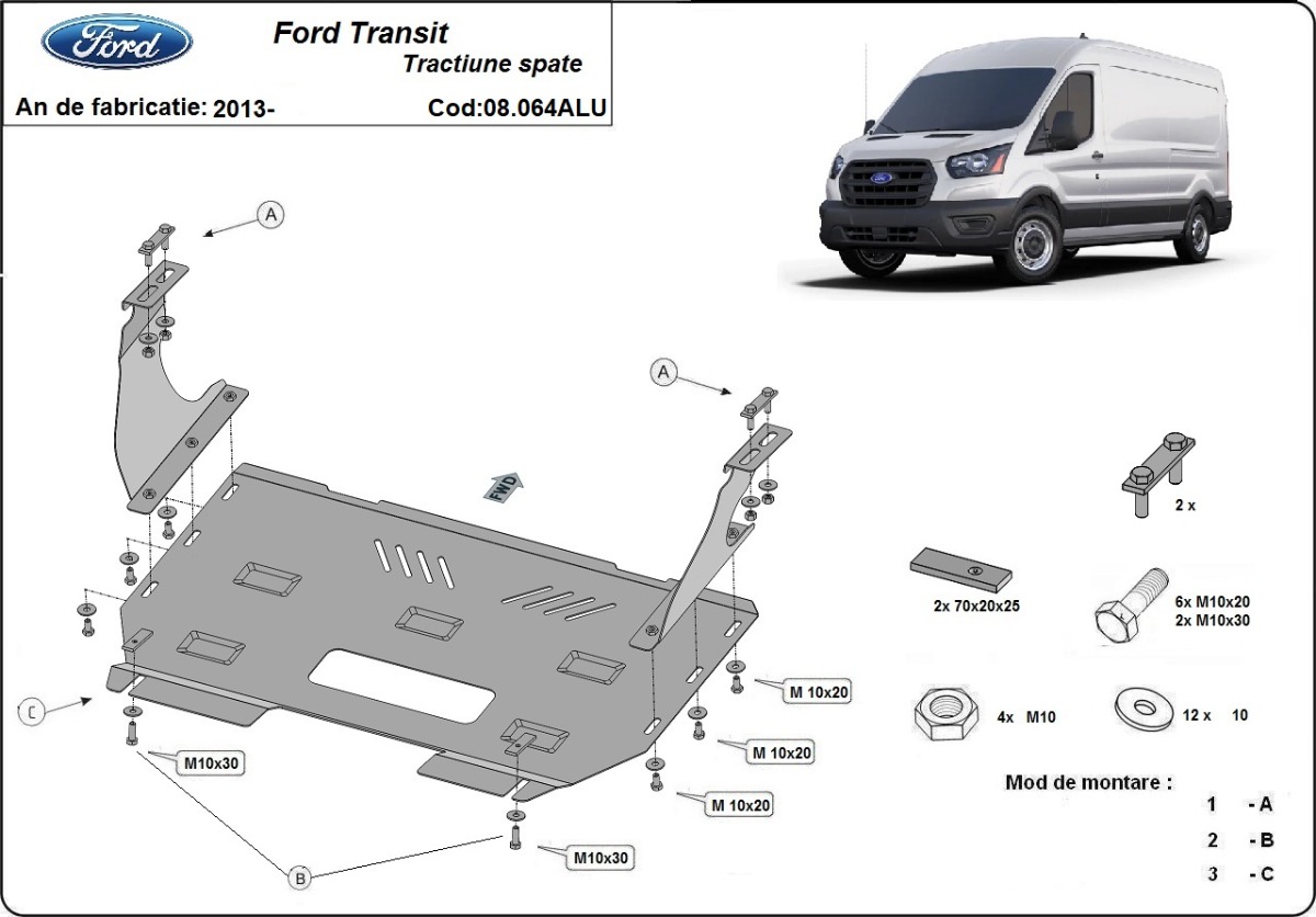 Aluminum engine and gearbox skid plate for Ford Transit RWD (2013-2026) with 3 mm and protection for the engine and gearbox.