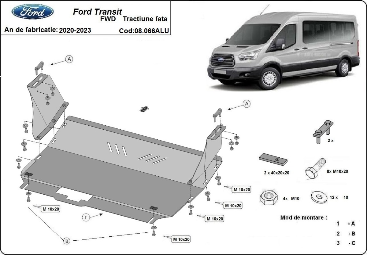 Aluminum engine, front bumper, gearbox, and radiator skid plate for Ford Transit FWD (2020-2023) with 3 mm and protection for the engine, front bumper, gearbox, and radiator.