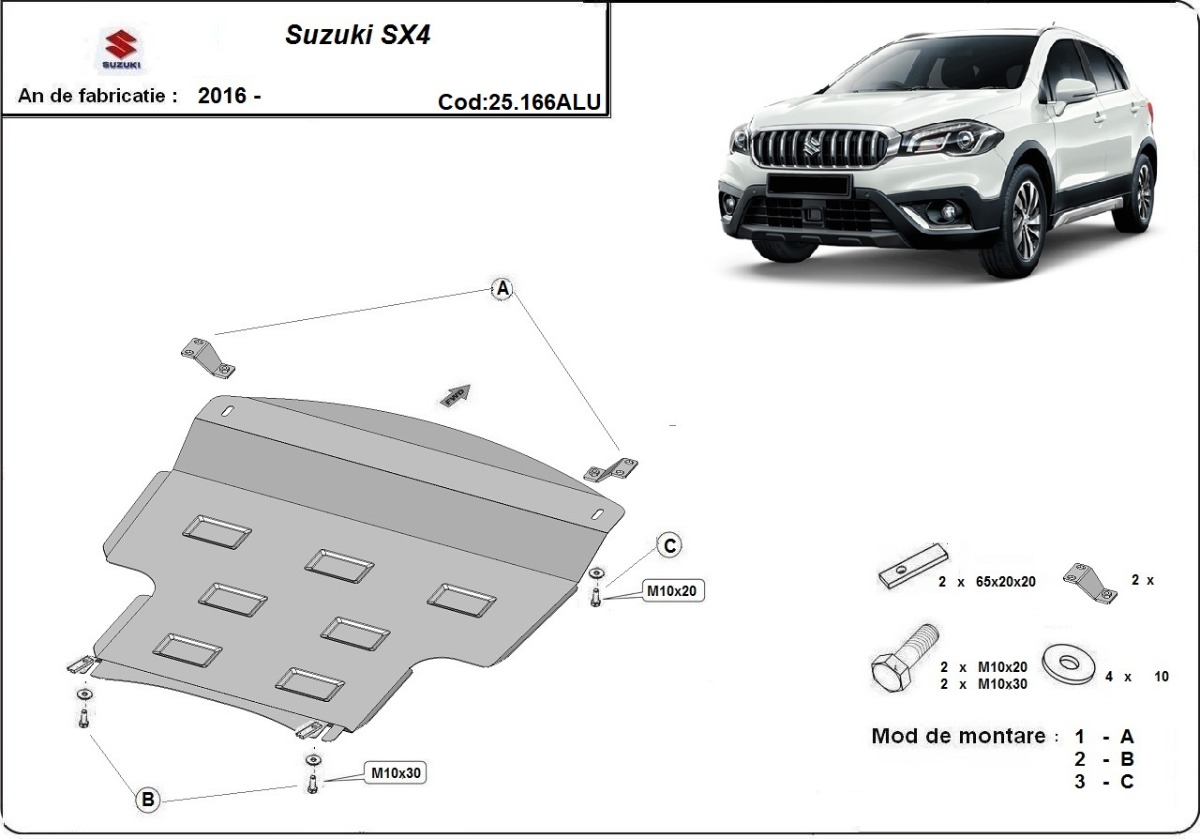 Aluminum engine, gearbox, and radiator skid plate for Suzuki SX4 (2013-2023) with 3 mm and protection for the engine, gearbox, and radiator.