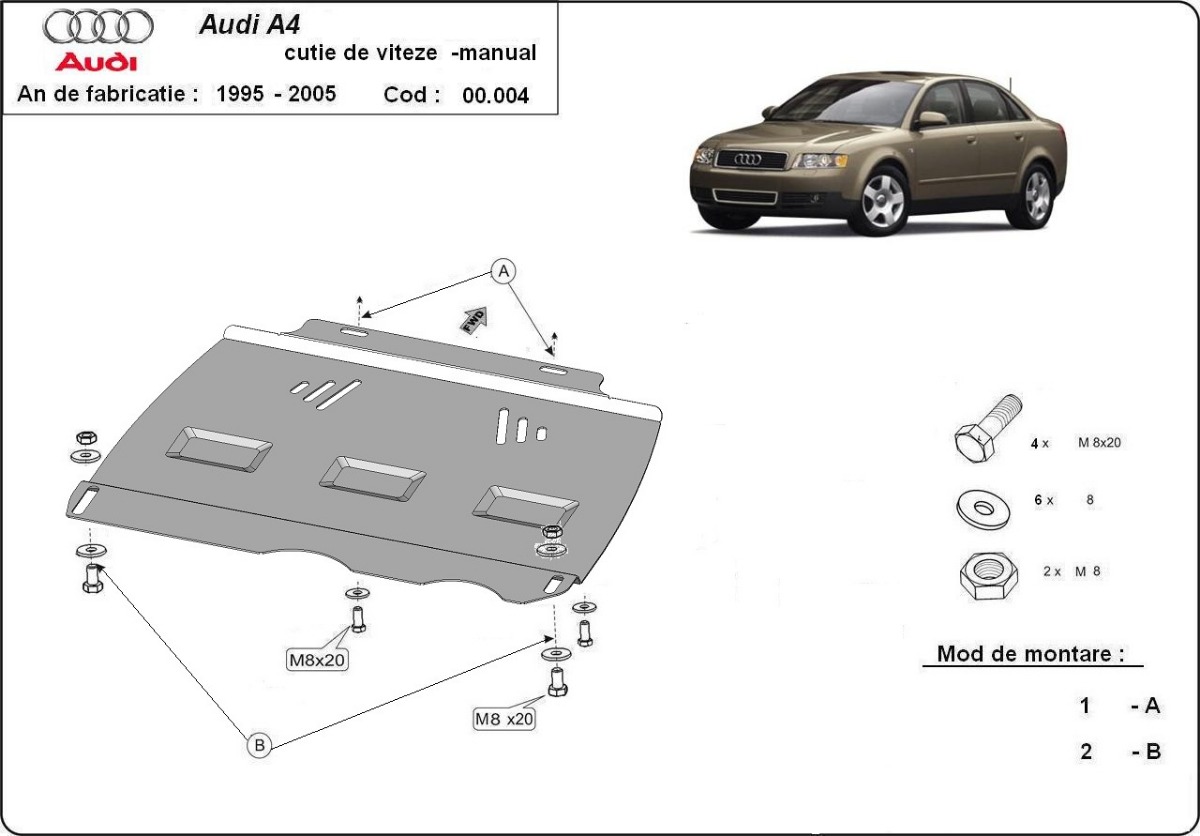 Material: high‑strength steel. Thickness: 2 mm. Approximate weight: about 4 kg. The gearbox guard mounts to the original underbody fixing points of the Audi A4 B5 and does not require drilling, cutting or any structural modification.