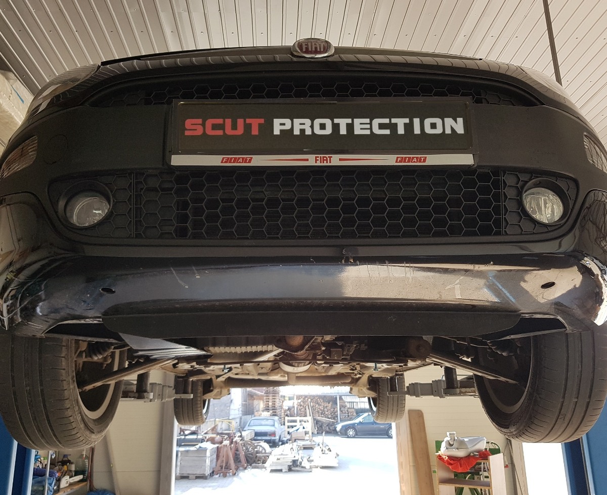 This steel underbody skid plate fits the Alfa Romeo Mito (2008–2018) and protects the engine, gearbox, and radiator in everyday driving and on uneven roads. It is relevant where the underside of the vehicle is exposed to stone chips, dust, mud, small stones, and rough road surfaces, such as on poorer roads or in changing weather conditions. This underbody protection helps reduce the risk of damage when driving over speed bumps, potholes, or loose gravel.