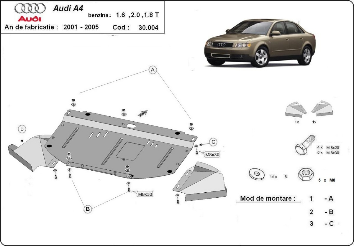 This skid plate fits Audi A4 B6 model years 2000-2005 with engines 1.6-2.0 and 1.8T. Check the VIN, model year, engine, and drivetrain before ordering. A 24-month warranty is included, delivery takes 3 to 4 business days with free shipping, and returns are accepted within 60 days after receiving the product.